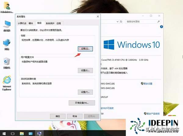 3、在系统属性中,选择性能选项,单击设置。
