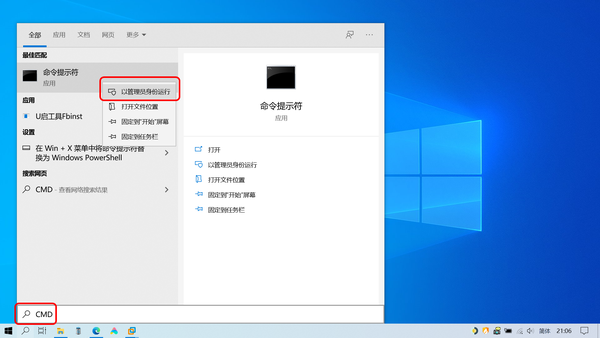 1、在电脑桌面底部任务栏上单击菜单搜索按钮,输入CMD,右键以管理员方式运行;
