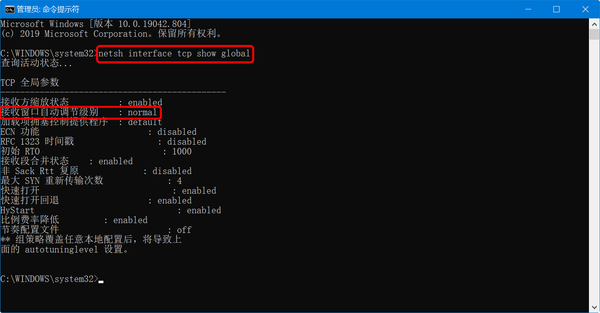 3、再输入命令 netsh int tcp set global autotuninglevel=disabled 然后按Enter回车键。会出现“确定”两个字,说明这一步设置成功;
