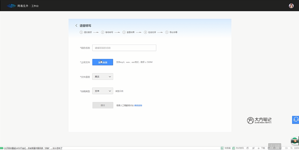 进入语音转写界面,点击添加音频,导入从PR中导出的MP3文件,文件语言选择中文(按需选择),出稿类型选择字幕,输入项目名称,最后点击提交。