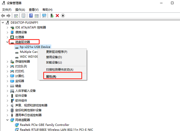 4. 在设备管理器界面中,找到“磁盘驱动器”下的U盘设备,右键选中“属性”进入。