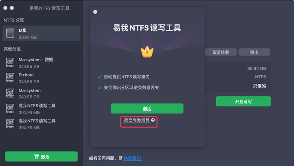 步骤 1. 启动易我NTFS读写工具,单击“我已有激活码”,输入激活码以解锁此软件。