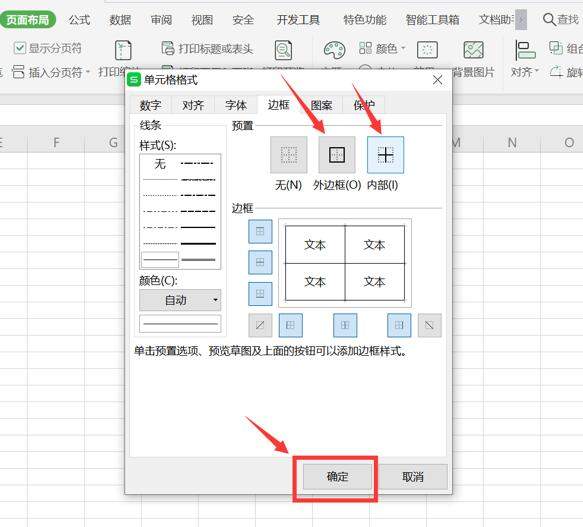 在“边框”一栏中选择“外边框”和“内部”,点击“确定”: