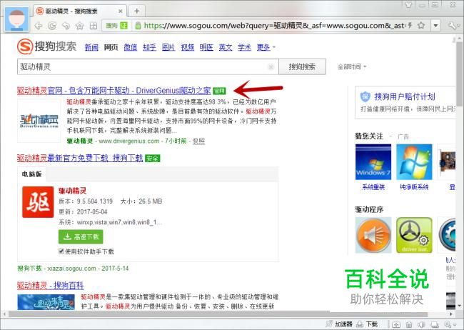 在电脑上打开搜狗浏览器,在搜索框中输入“驱动精灵”进行搜索。