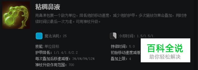 粘稠鼻液可以降低敌方英雄的护甲和移动速度,debuff可以累加。