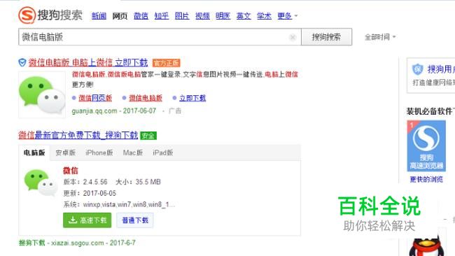 首先我们需要下载一个电脑版微信安装到电脑上;(直接打开搜狗搜索引擎,在搜索框中输入“微信电脑版”点击下载即可)