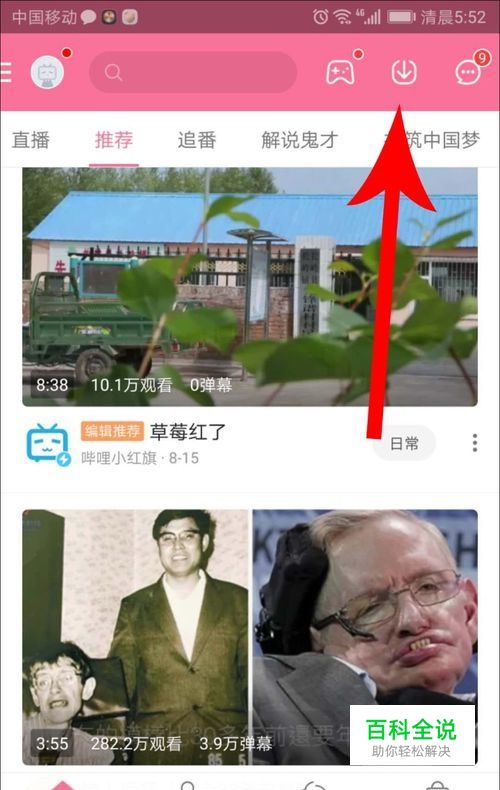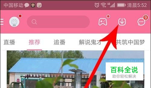 手机b站下载好的视频后,返回到b站主页上,然后在右上角点击“下载”图标,位置见下图箭头所指