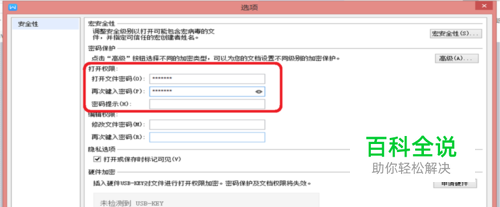 在弹出的安全性选项卡中,设置“打开权限”的密码,及“再键入密码”,设置完毕点击右下角的“确定”。密码提示可不设置。