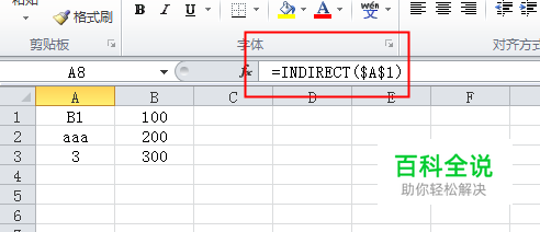 在下面单元格输入=INDIRECT($A$2),意思是查找A2单元格内容而A2单元格是aaa,正好B2单元格的名称为aaa,所以结果得200。