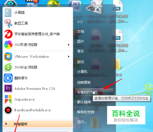 点击“开始”菜单,再点击打开“设备和打印机”。