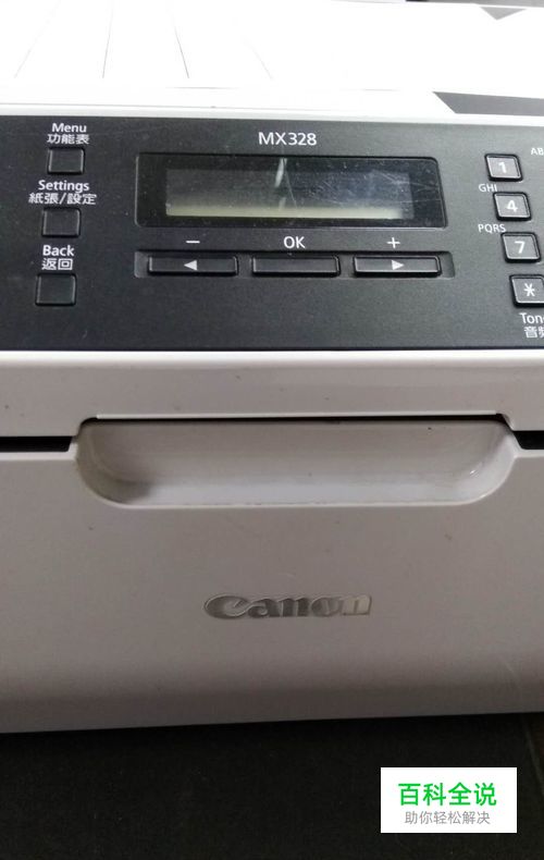 看打印机四周,都会有打印机名称。如下图是打印机前面板,就有打印机名称和型号“Canon MX328”