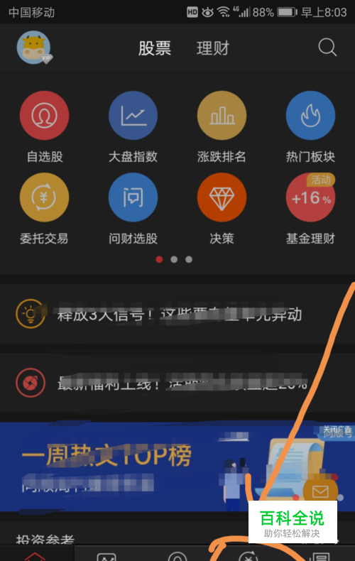 进入同花顺应用主界面之后,点按界面下方箭头指向的交易标志。