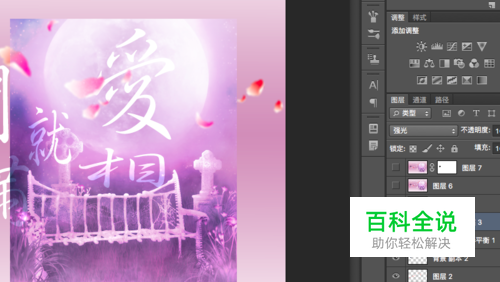 然后把另一张素材拖进去作为强调爱这个字,把月亮部分放到爱上,加蒙版擦除边缘,注意过度自然,混合模式为强光