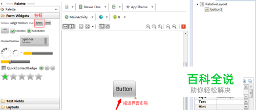 先在布局界面上,拖进来一个按钮控件,并设置显示的文字,记得保存(Ctrl+S)