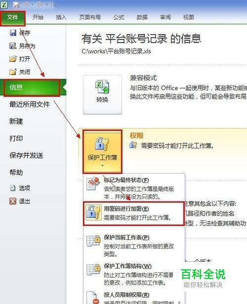 选择最左上角,文件》信息(左边导航)》权限(点击保持工作薄下的下三角型图标)》用密码进行加密。