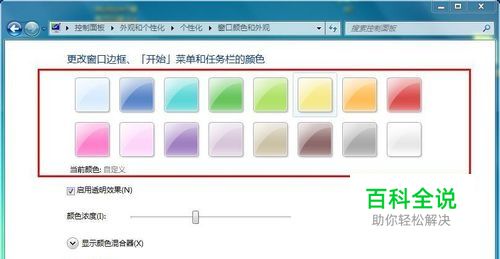 在“个性化”面板的下方,有一项是“窗口颜色——自定义”win7默认了17种颜色,也可以使用别的颜色。