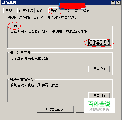 首先我们鼠标右键单击我的电脑,选择属性选项,点击进去后出现如图所示。我们选择高级大选项里的性能里的设置,点击进入。
