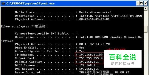 测试安装打印机的PC的局域网内网IP;方法(以XP为例):左下角开始按钮--运行--输入cmd回车--在打开的窗口中输入ipconfig /all后回车。 如图所示:出现内网IP和网关信息 在此:本示例教程中打印机的PC的内网IP为192.168.1.100