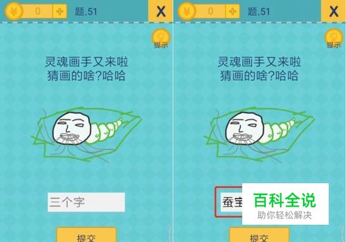 第51关 灵魂画手又来啦 这个还真的是灵魂画手,要猜三个字,这题的答案是蚕宝宝。。。看了答案后,觉得像吗?。。。