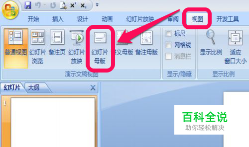 打开PowerPoint2007软件,单击“视图”菜单/"幻灯片母版"命令,进入到母版视图。