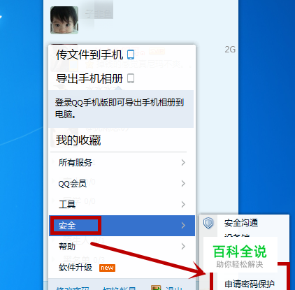 点击左下角的主菜单,选择“安全”,然后点击“QQ安全帮助”(这里点击安全中心首页和申请密码保护也可以找到我们需要的“。