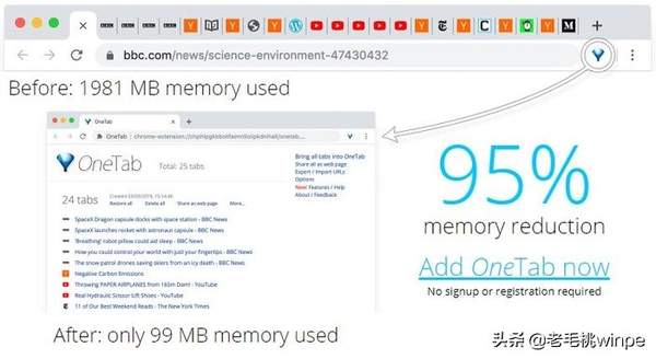 那么遇到Chrome吃内存太厉害了,我们有什么破解的方法吗?答案是有的!小编跟大家分享一个扩展程序,有效解决这个问题。它就是【OneTab】,一个能够减少Chrome高达95%内存占用的扩展程序。有需要的朋友赶紧拿去~