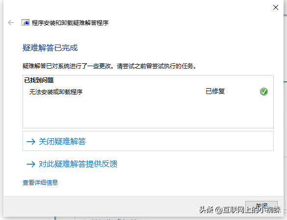 该工具将进行软件的尝试卸载操作,完成后出现下面的提示。是否已修复