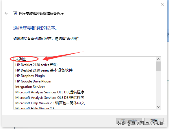 下面选择“卸载”,该工具将进行安装的软件进行扫描。扫描后将会罗列出在本机已经安装的相关软件列表。如果未有罗列,可以选择“未列出”通过输入产品的代码来选择未列出的程序。