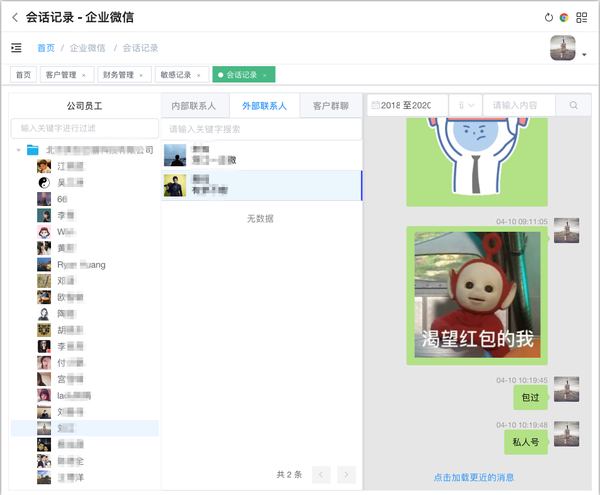 当然这个不能一票否决,虽然企业微信没有开放导出的功能,但企业微信开放会话存档的接口,可以把企业微信的记录存在云端,且永久保存呦!奥创软件研究院是首批腾讯授权的服务商,企业只需要配置奥创微企SCRM管理系统,就可以实现把所有的记录存在云端,且不仅仅是文字,还有图片,短语音,文档,链接,这都是小儿科的呦。告诉大家个彩蛋,员工主动撤回,以及删除的信息也会被备份下来且可以提醒给管理层,这个自行补脑,怕被打~~