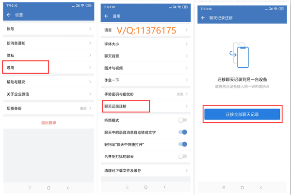 打开企业微信—设置—通用—聊天记录—聊天迁移—迁移全部聊天记录。