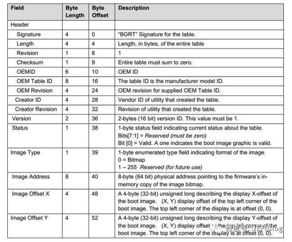 你也许猜出来了,作为一个UEFI的专栏,原因当然在UEFI固件里了。UEFI在ACPI 5.0时加入了BGRT表(Boot Graphics Resource Table)。它是一个可选的表单,固件用来向OS报告它希望OS在启动时显示的图片: