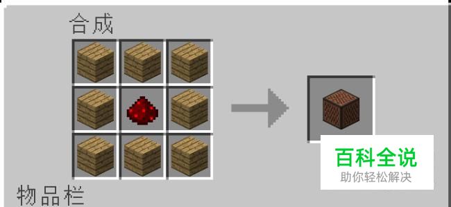 通过工作台像下图所示,八个木块和一个红石合成一个音符盒。把音符放在地上或者是其他的方块上,然后用右键点击就可以发出声音,每次点击发出的声音都不同,从doremifa开始一共24个循环。