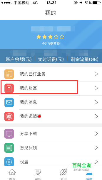第一步登录自己的手机号后,然后在手机营业厅的“我的”页面点击“我的财富”。