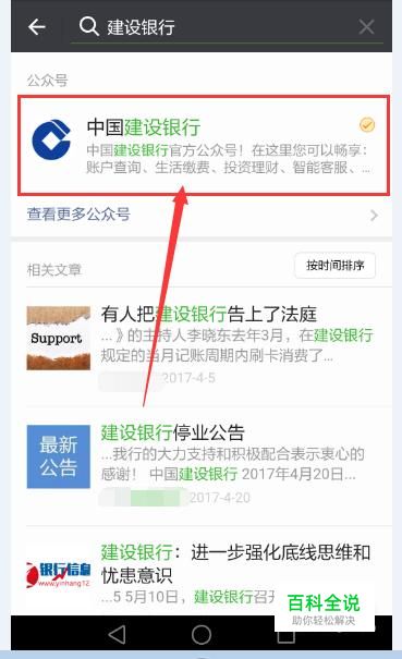 搜索结果出来之后,点击第一个认证的建设银行公众号。