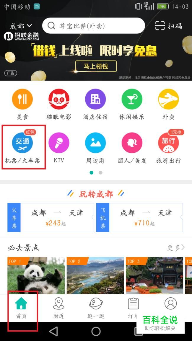 登录了账号后,回到首页。首页就有很多的点餐,购票先项。在左边我们可以看到“机票/火车票”的选项,我们要点进去。