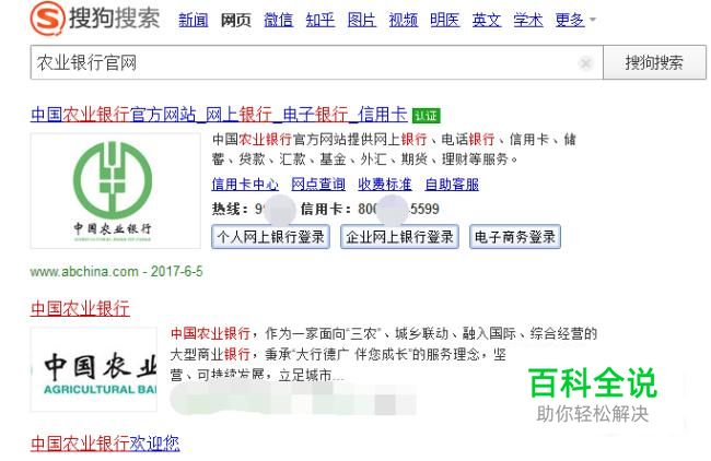 打开搜狗浏览器,在搜索页输入:农业银行。在出现的选项点击进入农业银行官网。