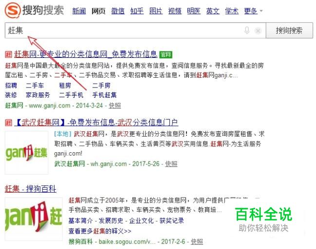 使用搜狗搜索输入赶集关键则,查找赶集网的官方网站。如图所示: