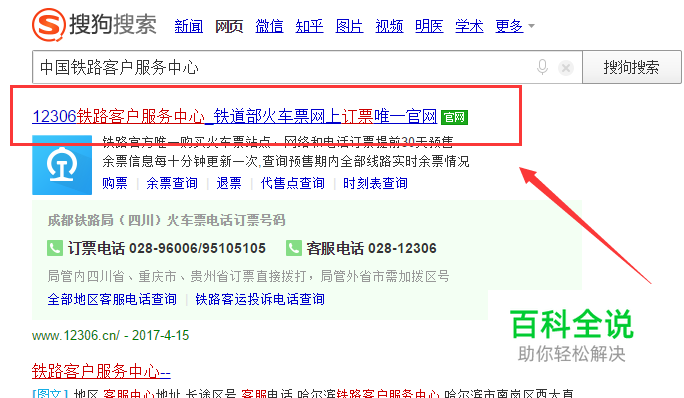 首先打开搜狗搜索,在搜索框中输入“中国铁路客户服务中心”,如图,进入12306官网。