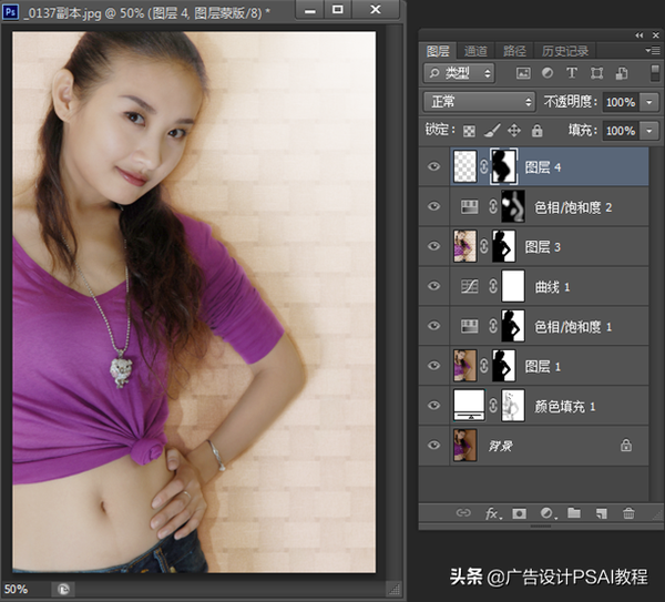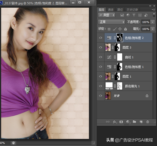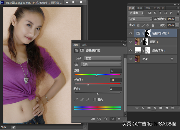 3、载入蒙版选区,添加色相饱和度调整图层,改变背景色相,并降低饱和度。让人物与背景颜色更协调。