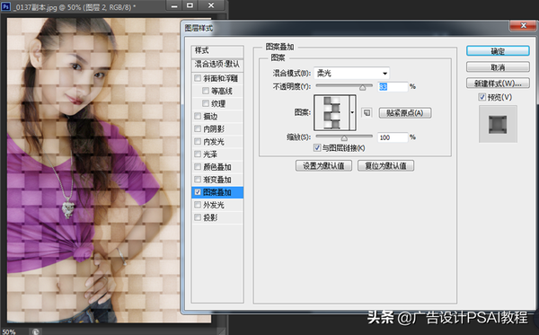 5、盖印图层,为了减轻背景阴影部分效果,选择图层样式—图案叠加。