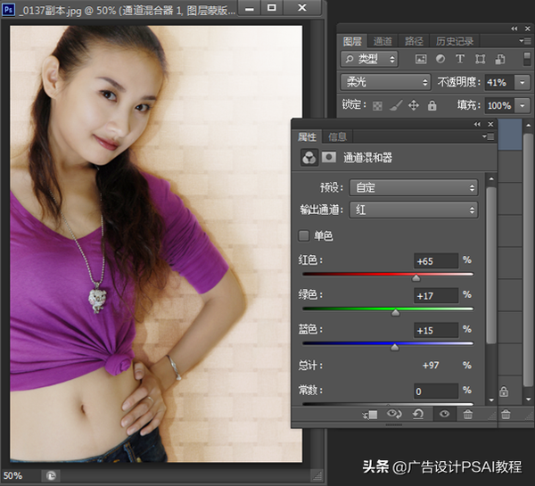 10、添加通道混合器调整图层,选中红色通道,适当添加暖色调;并将图层混合模式设为柔光模式,增加图像的对比度。