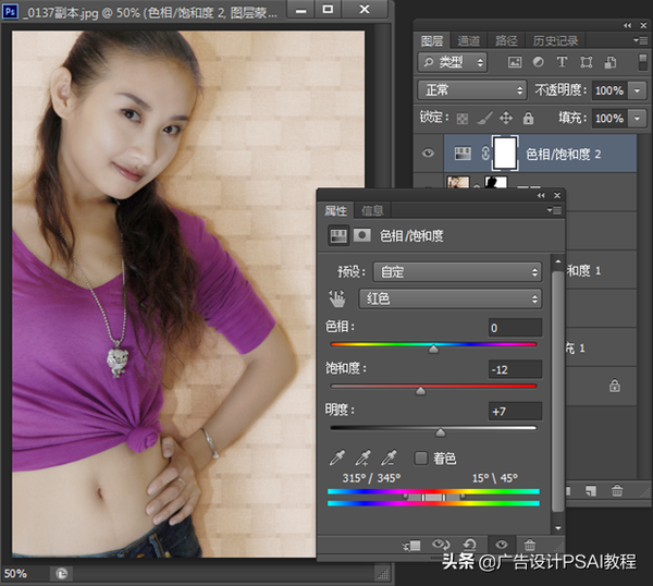 7、建立色相饱和度调整图层,选择红色,降低饱和度,增加明度。使人物胸部的色彩与整体色彩更协调。
