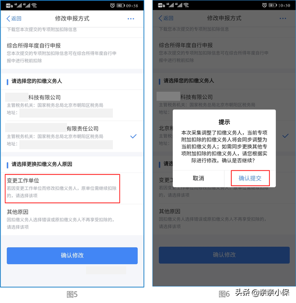(1)由新单位在申报系统中采集并报送你的个人信息,一般最迟3天内APP中会自动添加上任职受雇信息,之后打开APP一常用业务一专项附加扣除信息查询一选择需要更改的项目一修改一修改申报方式。更换扣缴义务人原因根据实际情况选择变更工作单位即可,之后和单位确认下是否能在申报系统中下载到你的专项附加扣除信息。如下图1-6所示。