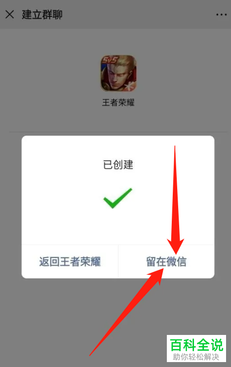 4. 第四步等待创建完成,根据下图箭头所指,点击【留在微信】选项。