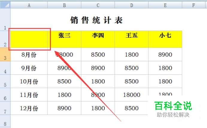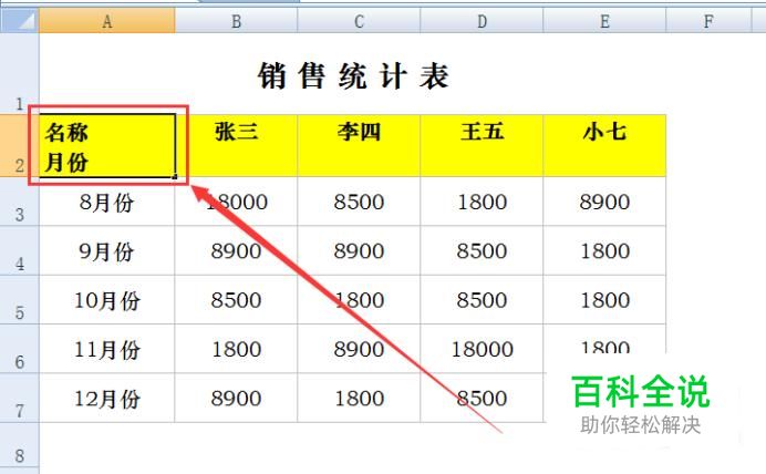 再点击“确定”后,在A2单中格中,输入“名称、月份”;