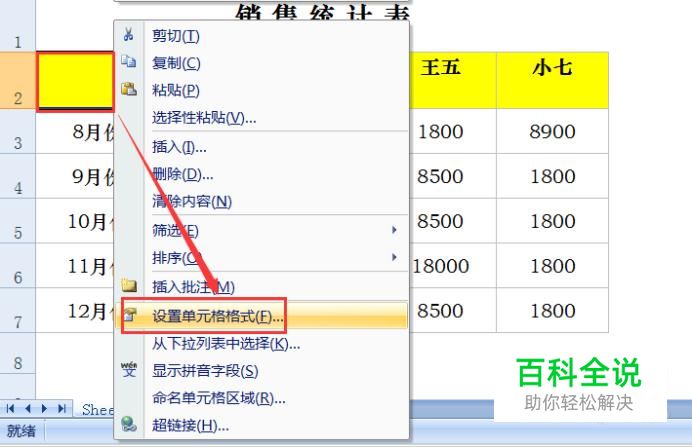 点击A2单元格,鼠标右击,在页面弹出的选项中,点击“设置单元格格式”;