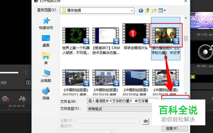 选择打开原视频文件 找到原视频文件存储的位置(为了方便编辑,可以直接将视频文件存储在电脑桌面),选中原视频文件,然后在图示位置点击【打开】,完成视频文件的插入。