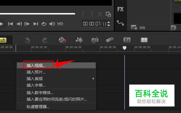 插入原视频文件 打开会声会影X9软件,在位于页面最下方的导轨上点击鼠标右键,在右键列表中选择【插入视频】。