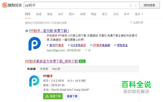这种情况是因为软件不稳定造成的,所以我们需要对软件进行修复,我们在电脑上打开搜狗浏览器,然后搜索pp助手进行安装。