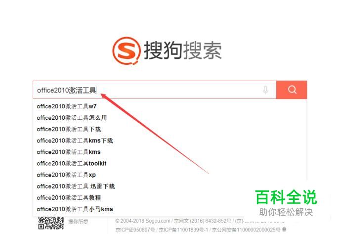 以office2010为例,先去网上下载激活工具,点开搜狗搜索,输入:office2010激活工具,点击搜索。